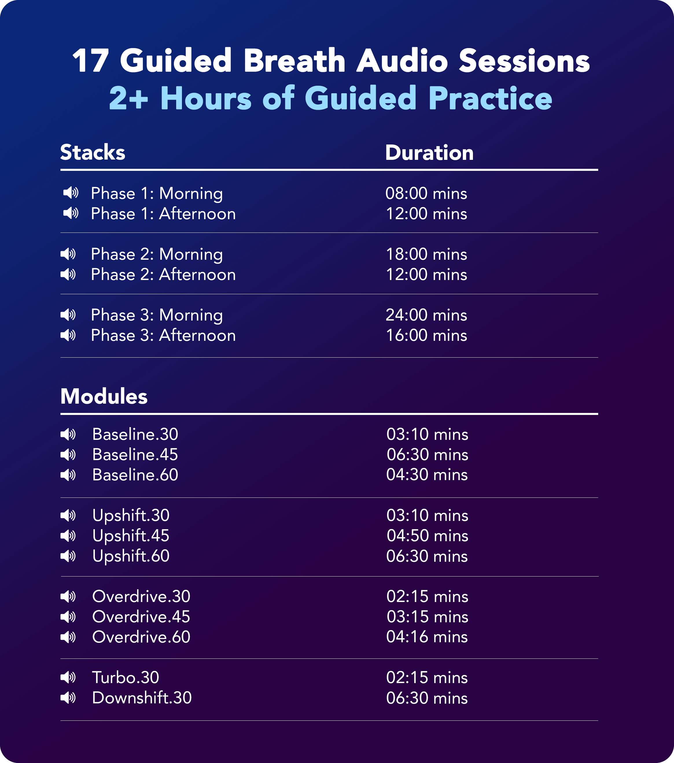 Each session is structured with specific breath counts and timed holds, measured and repeatable, so your nervous system receives a consistent daily stimulus.