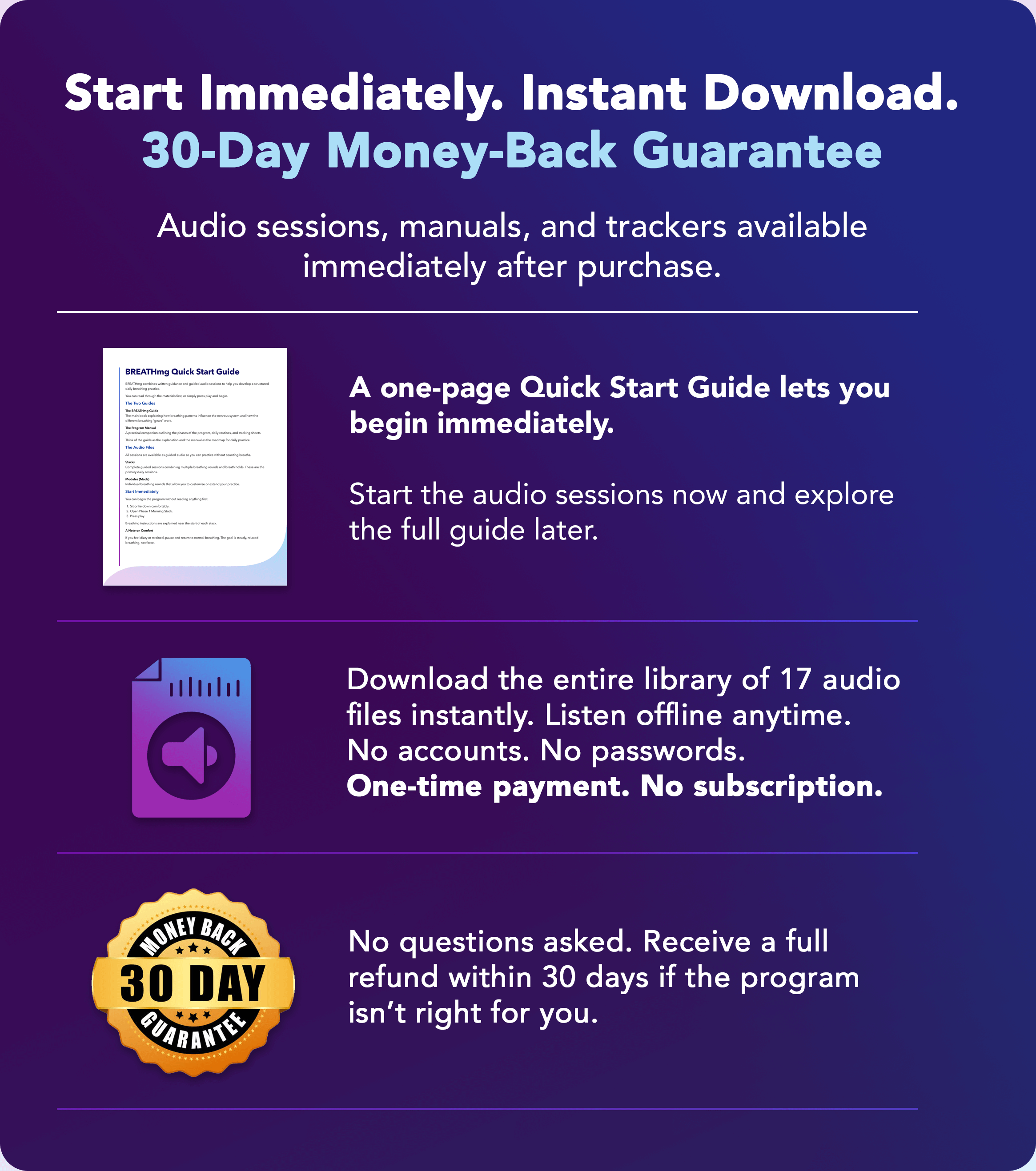 Hear the pacing, breath counts, and structure of a guided BreathMG session before starting the program.