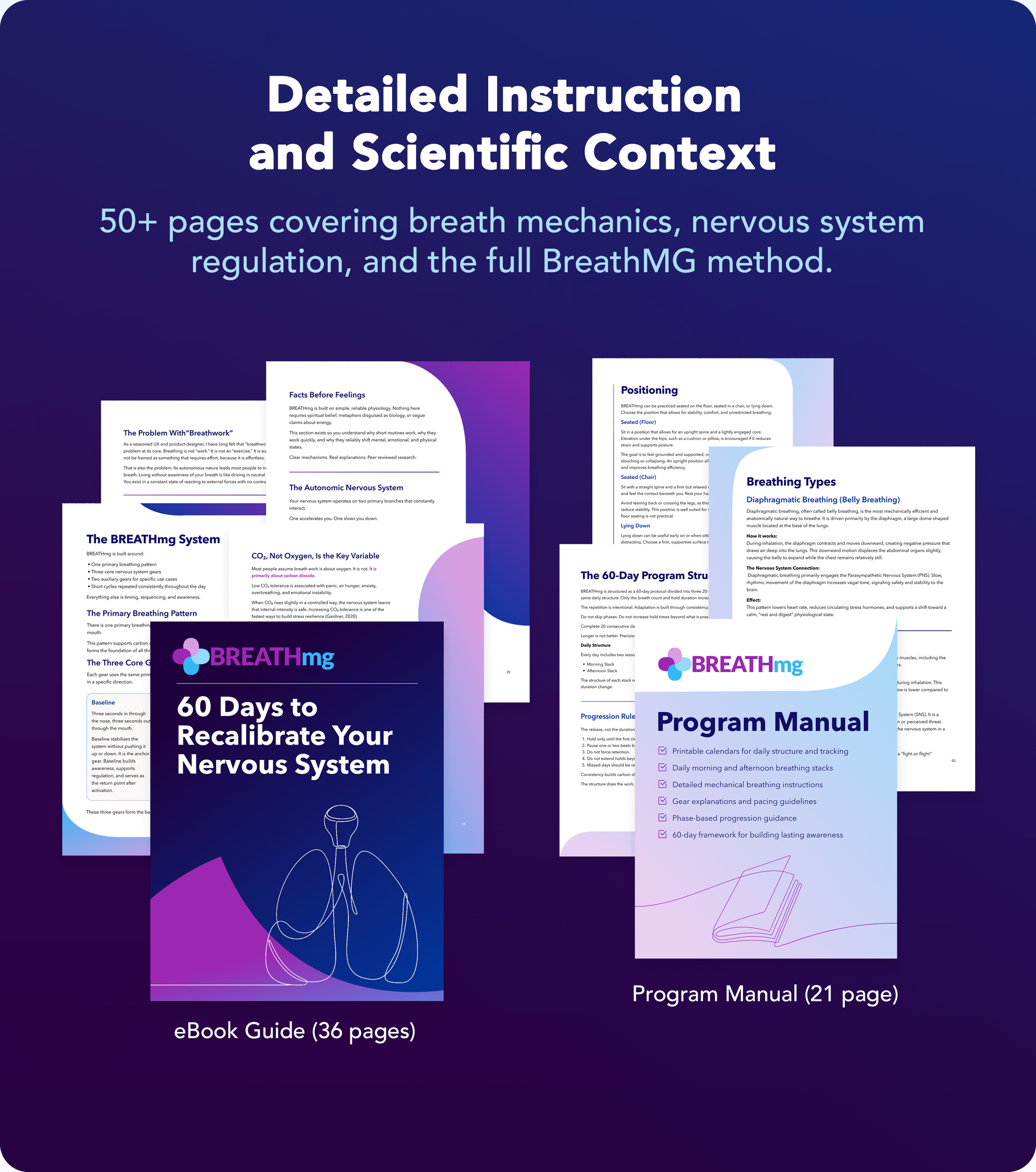 BREATHmg is a structured 60-day breath training system built around a single idea: your nervous system has gears, and breathing is the gearshift.